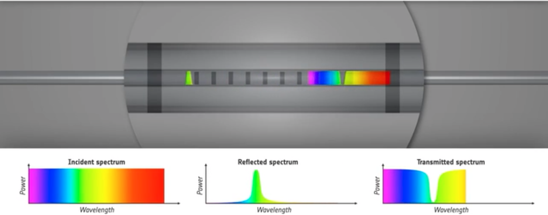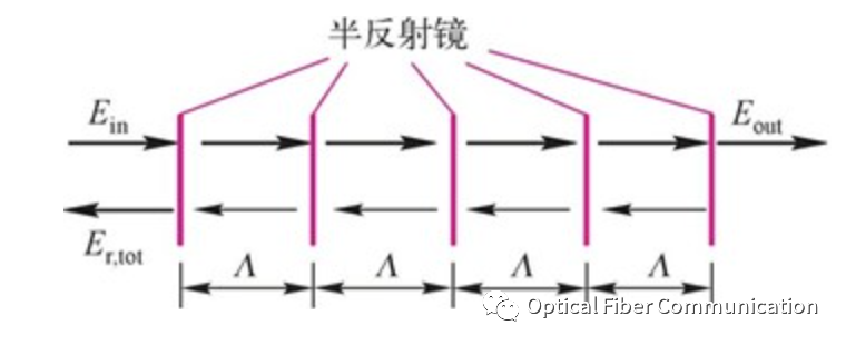 由间距为 Λ 的一列平行半反射镜组成,Λ称为布拉格间距,如下图所示。布拉格光栅的基本特性就是以共振波长为中心的一个窄带光学滤波器,该共振波长称为布拉格波长。