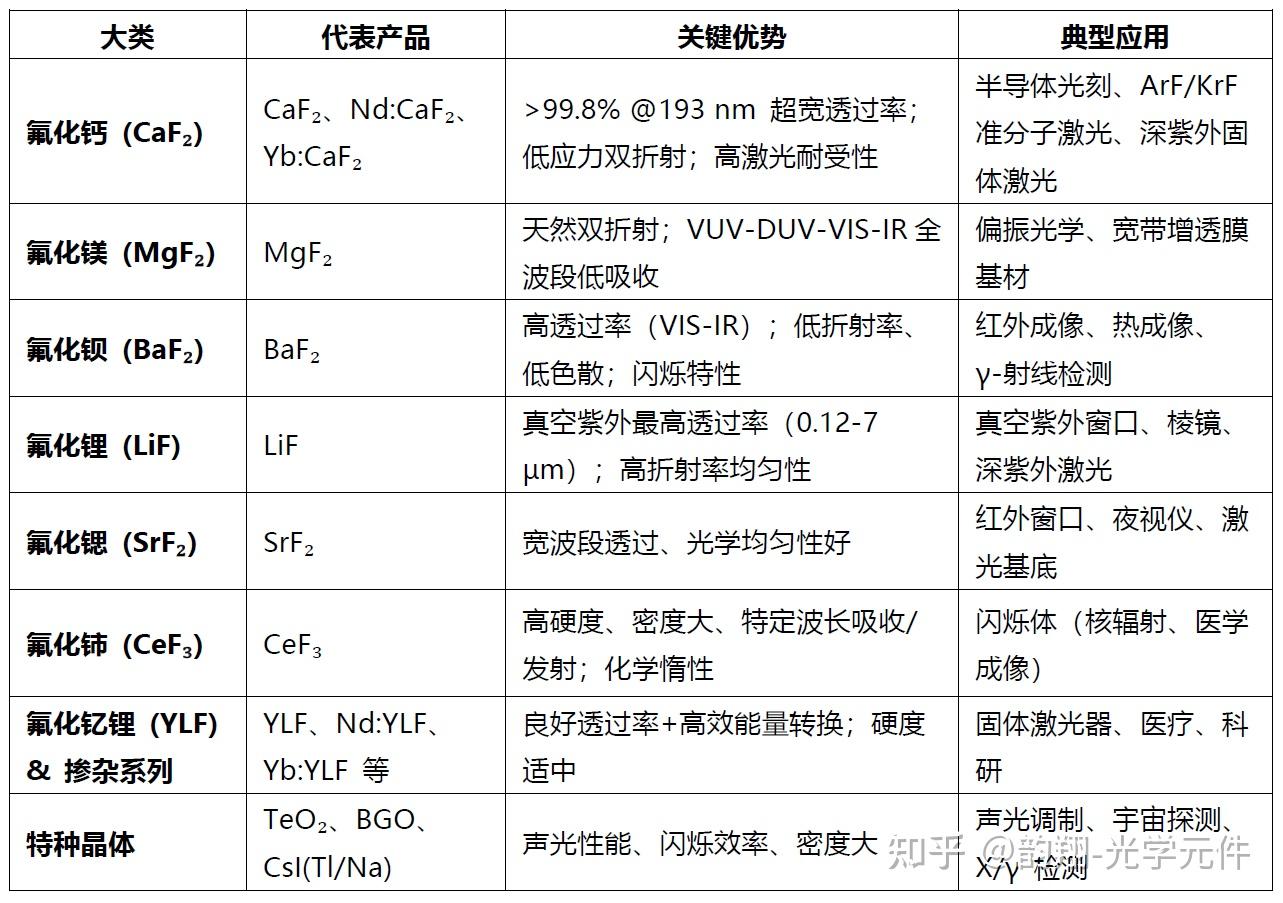 - **[Calcium Fluoride (CaF2)](https://www.google.com/search?q=Calcium+Fluoride+%28CaF2%29&rlz=1C5GCCM_en&oq=fluoride+material+optics&gs_lcrp=EgZjaHJvbWUyBggAEEUYOTIKCAEQABiABBiiBDIHCAIQABjvBTIHCAMQABjvBTIKCAQQABiABBiiBDIGCAUQRRhAMgYIBhBFGEAyBggHEEUYQNIBCTE3MDg3ajBqMagCALACAA&sourceid=chrome&ie=UTF-8&mstk=AUtExfAszYNqrZdOxQow3Vb6dCNItoerpNdXMTIsToPDohML-a2X2WokmCNQKSsaN014kKx_e-nwoDDuAjrPPOycnw2e_VI7gXKJPf0ghiOX_5JEHyuKal3IKmVdkGcEz0qDIdSakzVNPAQROeKPRU64yz9mGtI9aykiBzOJfQnWSvpgM1ROyV-cBV_RU6HmJ3y1oRgm&csui=3&ved=2ahUKEwj1qMrs8Z6QAxW3DTQIHfuSKusQgK4QegQICBAB):**